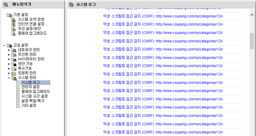 iptime(아이피타임) 공유기에 로그인해서 고급설정 - 시스템관리 - 시스템로그 기록을 보면 악성스크립트 감지 (CSRF) 로그가 계속 찍힐수있습니다..